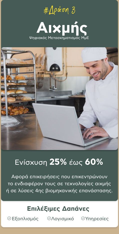 Υποβολή αίτησης χρηματοδότησης επιτρέπεται είτε μόνο στη «Δράση 1 – Βασικός Ψηφιακός Μετασχηματισμός ΜμΕ», είτε μόνο στη «Δράση 2 – Προηγμένος Ψηφιακός Μετασχηματισμός ΜμΕ», είτε μόνο στη «Δράση 3 – Ψηφιακός Μετασχηματισμός Αιχμής ΜμΕ».
